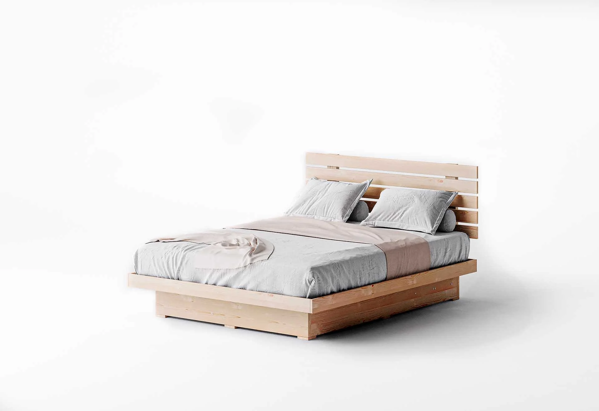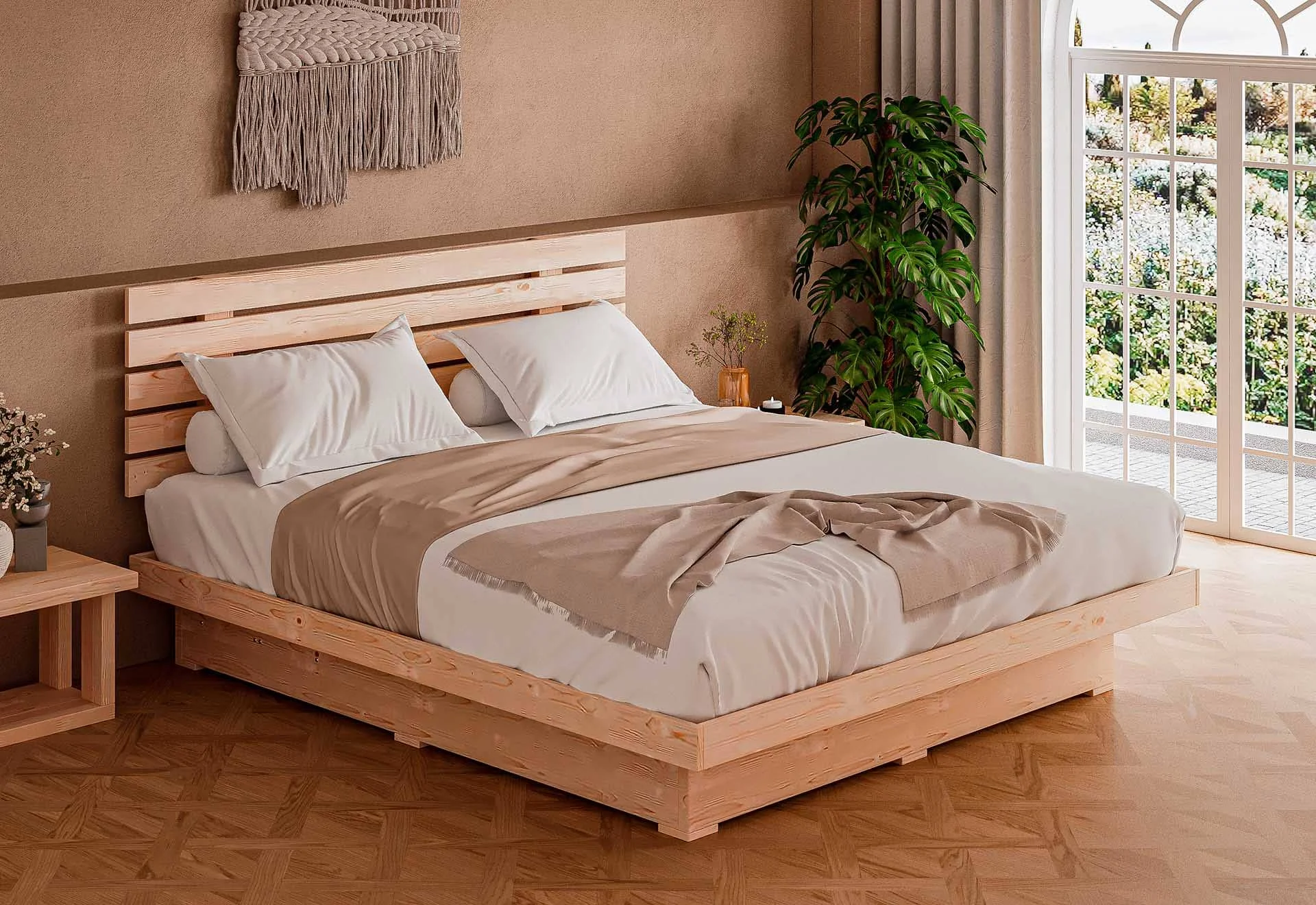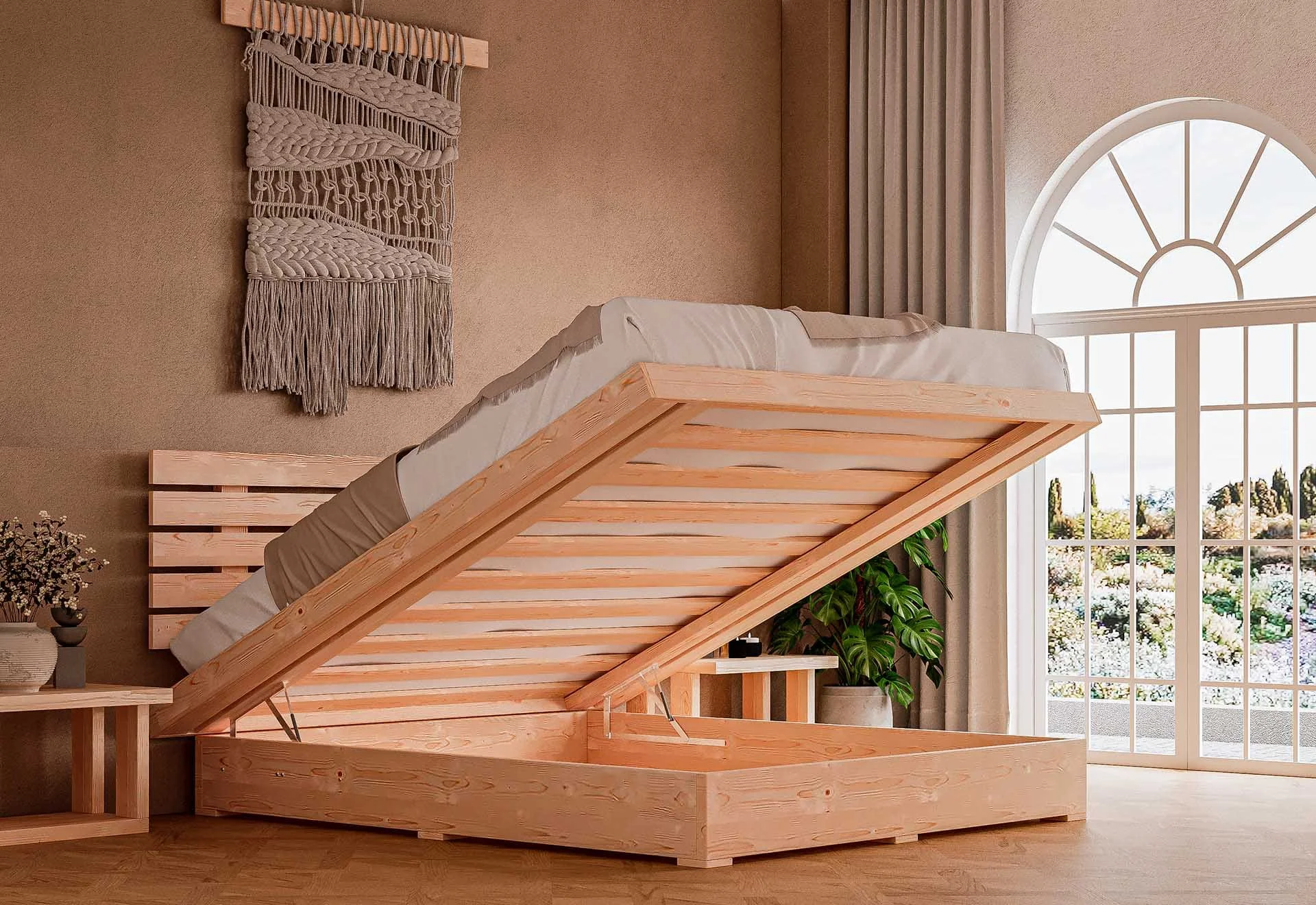 בסיס מיטה זוגית עם ארגז מצעים מעץ אורן מלא עם ארגז מצעים מתרומם, המאפשר שטח אכסון גדול ונגיש במיוחד.